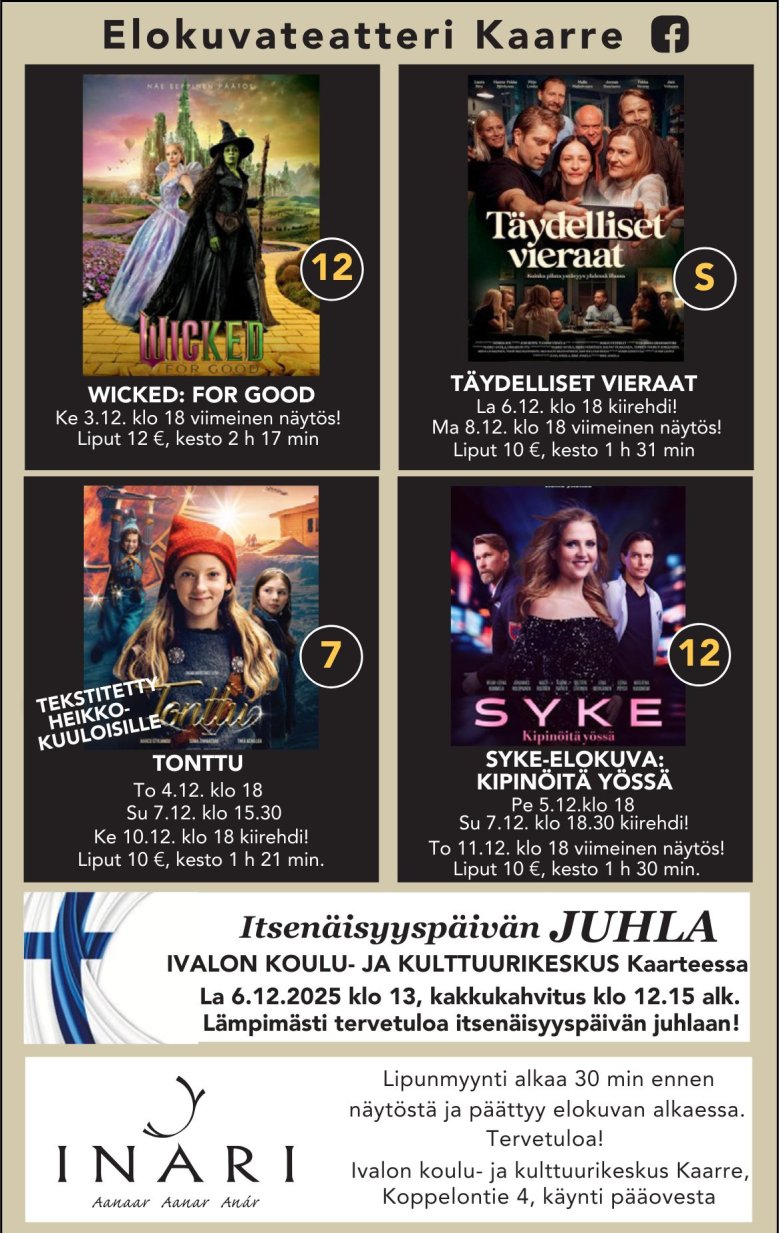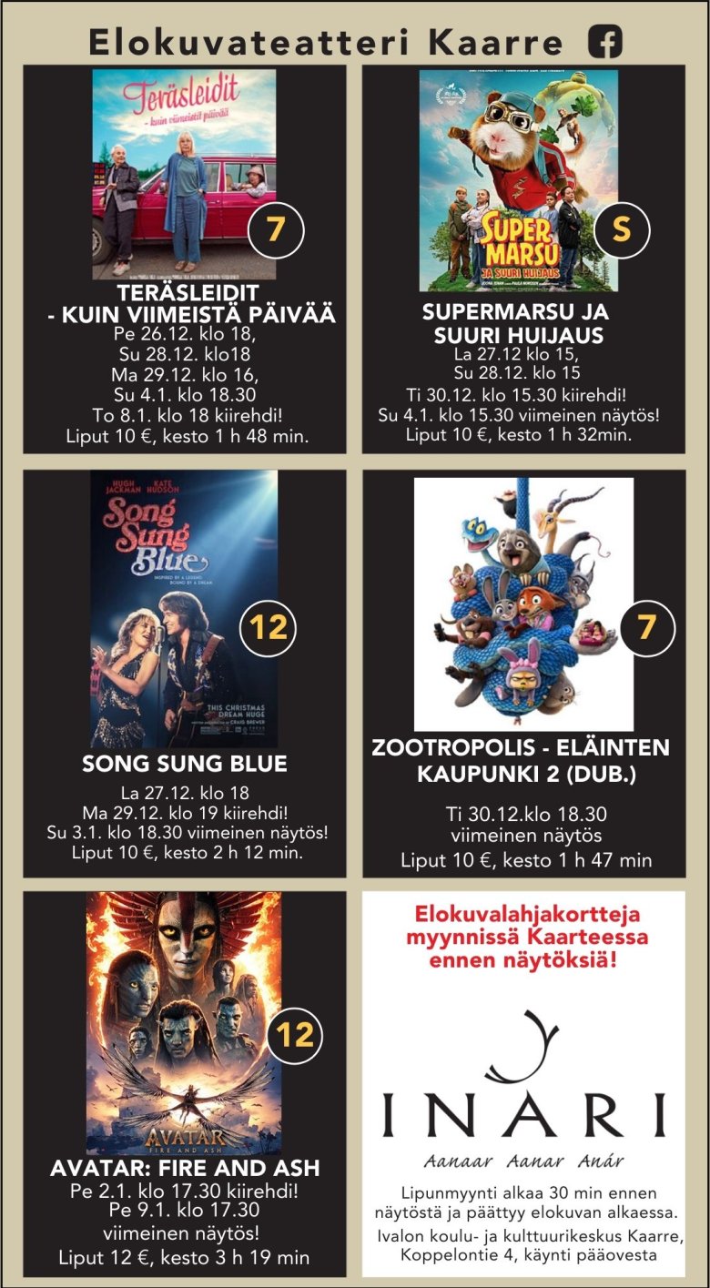 JULKAISEMME JOKA VIIKON TIISTAINA KULUVAN VIIKON ELOKUVAOHJELMISTON TÄLLE SIVULLE, INARIN KUNNAN JA ELOKUVATEATTERI KAARTEEN FACEBOOK-SIVUILLA JA PAIKALLISLEHTI INARILAISESSA.