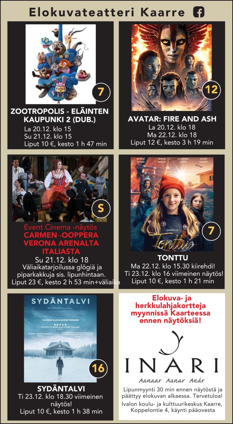 JULKAISEMME JOKA VIIKON TIISTAINA KULUVAN VIIKON ELOKUVAOHJELMISTON TÄLLE SIVULLE, INARIN KUNNAN JA ELOKUVATEATTERI KAARTEEN FACEBOOK-SIVUILLA JA PAIKALLISLEHTI INARILAISESSA.