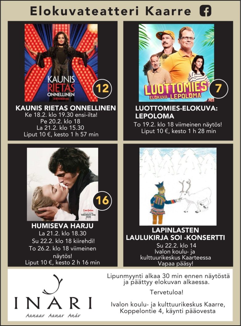 Voit vaikuttaa leffavalikoimaan jättämällä toiveita Facebookin kautta @elokuvateatterikaarre, puhelimitse kulttuurisihteeri numeroon 040 7767546, postitse kunnantalolle (Kulttuuritoimi, Piiskuntie 2, 99800 Ivalo) tai sähköpostiin mirja.karjalainen@inari.fi.