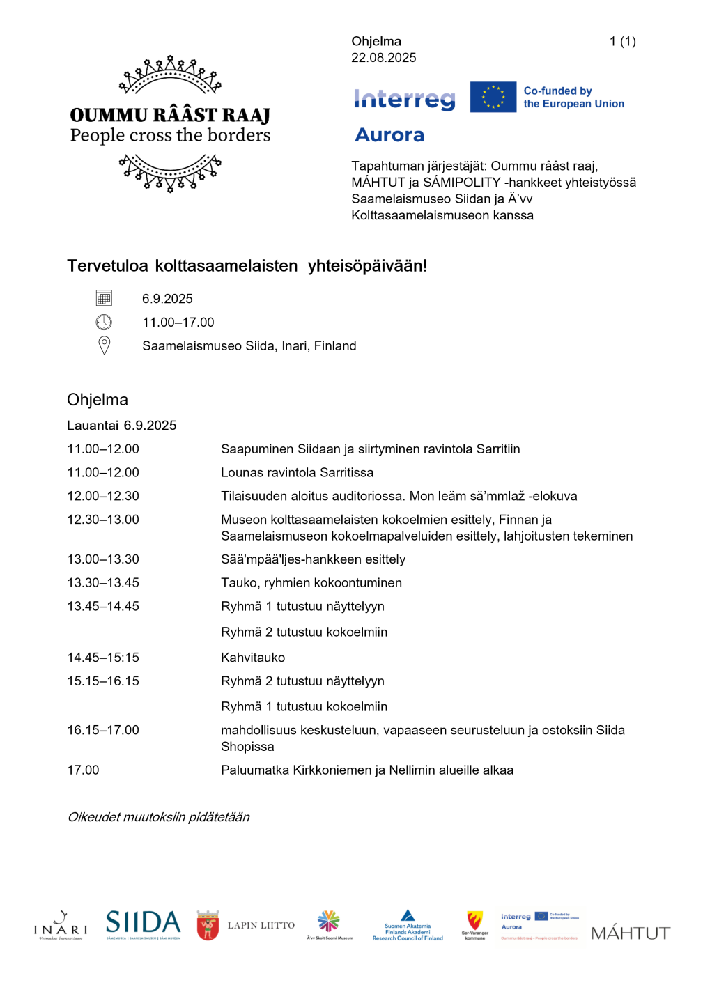 Lauantaina 6.9.2025 vietettin kolttasaamelaisten yhteisöpäivää Saamelaismuseo Siidassa. Päivän ohjelmaan kuului tutustuminen Siidan päänäyttelyyn sekä erityisen, vain sitä päivää varten kootun kolttasaamelaisesinekokoelman esittely. Esineet oli valittu osallistujien äänestyksen perusteella. Tarkemman ohjelman löydät alta. Tapahtuma tarjosi mahdollisuuden tavata ja verkostoitua rajat ylittävän kolttayhteisön kesken. Tapahtuman aikana tarjottin lounas ja kahvit, ja osallistujille oli järjestetty ilmainen kuljetus Kirkkoniemestä ja Nellimistä Inariin ja takaisin.