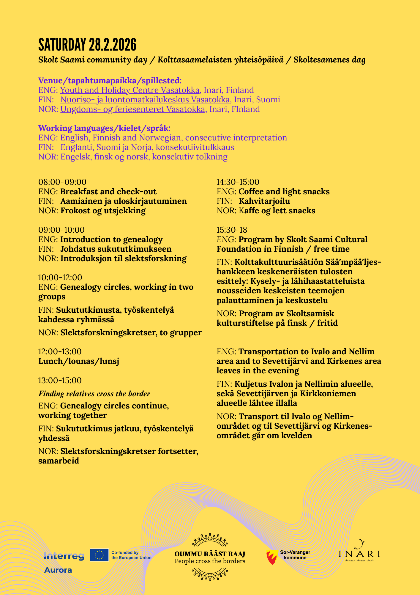 Seminaari kolttasaamelaisten historiasta, kulttuuriperinnöstä ja psykologisesta tuesta järjestetään Inarissa 27.2.–28.2.2026. Perjantaina luvassa on mielenkiintoinen, monipuolinen ja kaikille avoin kattaus luentoja ja paneelikeskustelua alansa asiantuntijoilta. Ohjelma alkaa klo 11:00 Saamelaiskultturikeskus Sajoksessa ja päättyy klo 18:15. Seminaari jatkuu lauantaina Nuoriso- ja luontomatkailukeskus Vasatokassa kolttasaamelaisten yhteisölle tarkoitetulla käytännön työpajalla, jossa sukelletaan sukututkimuksen kautta omaan taustaan ja historiaan.