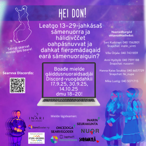 Järjestämme 13-29-vuotiaille saamelaisnuorille etänuorisotilatoimintaa Discord -alustalla. Toiminnan tavoitteena on tuoda yhteen saamelaisnuoria, lisätä heidän hyvinvointiaan ja ehkäistä yksinäisyyttä. Lisäksi nuortenilloilla pyrittäisiin vahvistamaan nuorten sosiaalisen kanssakäymisen taitoa sekä yhteisöllisyyttä ja osallisuutta. Työntekijät ovat sitoutuneet huomioimaan saamelaiskulttuurin erityispiirteet. Toiminta alkoi syyskuun alussa ja nuorisotilan vetäjinä toimii nuorisotyöntekijöitä Lapin alueen kunnista sekä seurakunnista. Illoissa on mukana myös muita työntekijäitä esimerkiksi kunnista, järjestöistä ja Lapin hyvinvointialueelta. Työntekijät ovat suomen- ja/tai saamenkielisiä, nuorille ei ole kielitaitovaatimuksia.