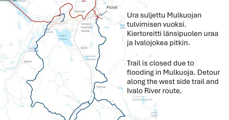 Ivalo-Saariselkä itäpuolen moottorikelkkaura on suljettu Mulkuojan tulvimisen vuoksi toistaiseksi!