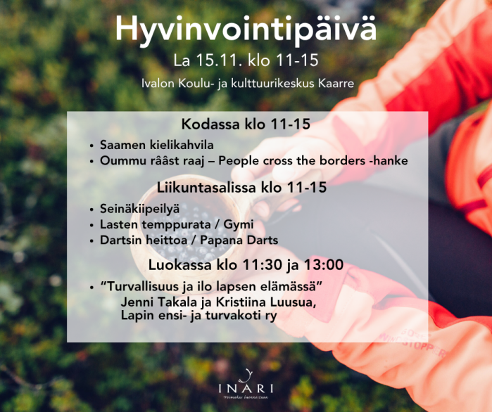 Lisätietoja: hyvinvointikoordinaattori Leena Korhonen: leena.korhonen@inari.fi / 040 643 4305