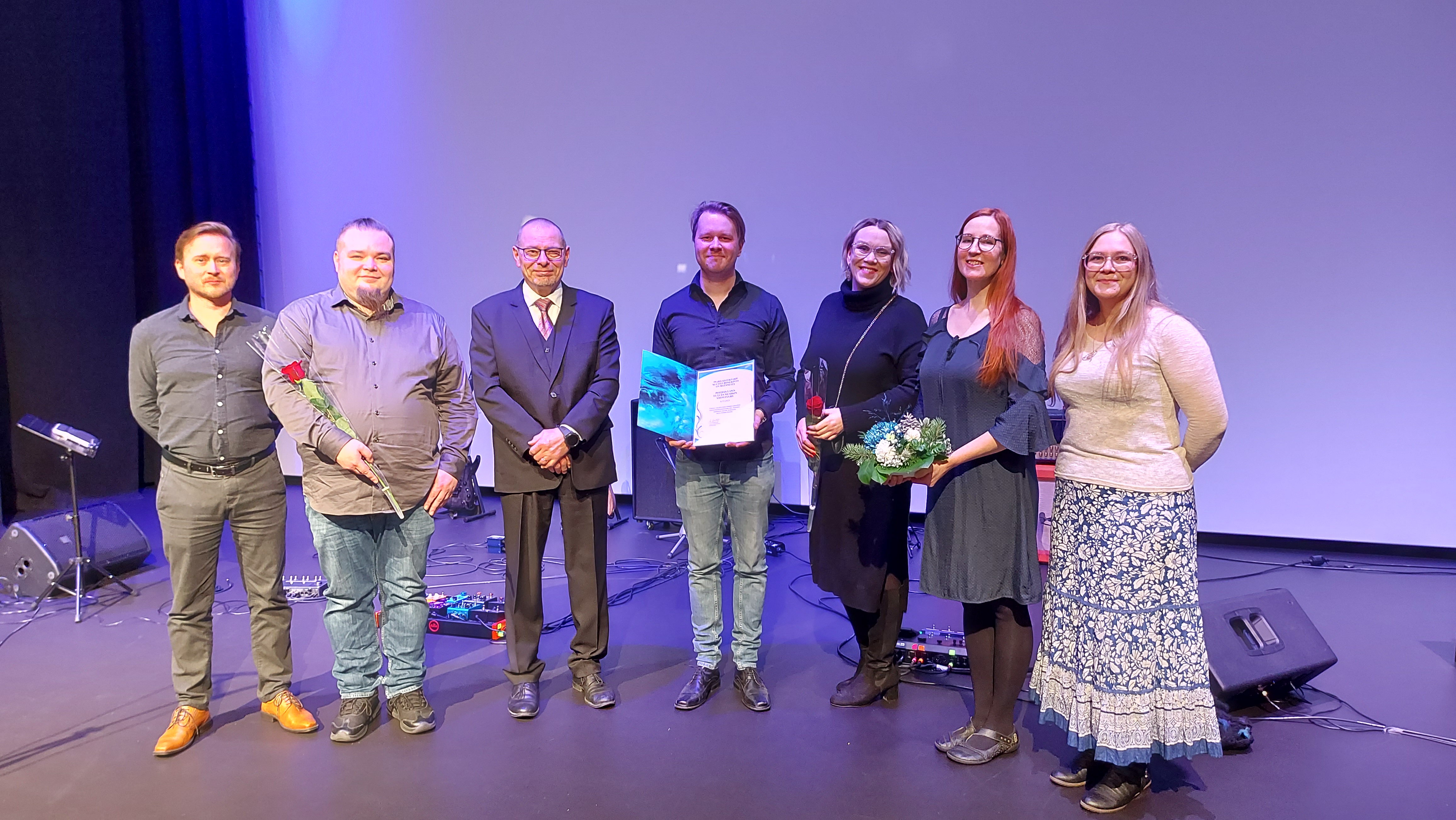 Kuva: Palkintoa vastaanottivat Pohjois-Lapin Elävän musiikin yhdistys ry:stä Keijo Kauppinen, Jonne Fofonoff, Joonas Talka, Sanna Aikio ja Katri Kittilä. Inarilaisteko-kulttuuripalkinnon luovuttivat Inarin sivistyslautakunnan puheenjohtaja Jari Huhtamella ja kulttuurisihteeri Mirja Karjalainen.