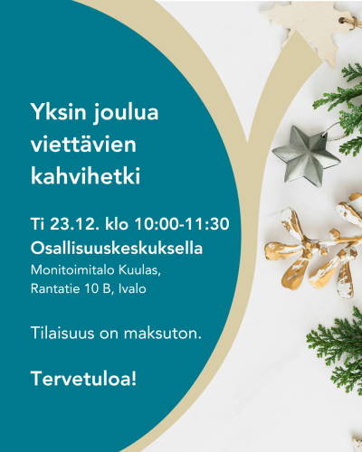 Vietätko joulua yksin? Tule kahvistelemaan ja rupattelemaan Osallisuuskeskukselle tiistaina 23.12. klo 10:00-11:30.