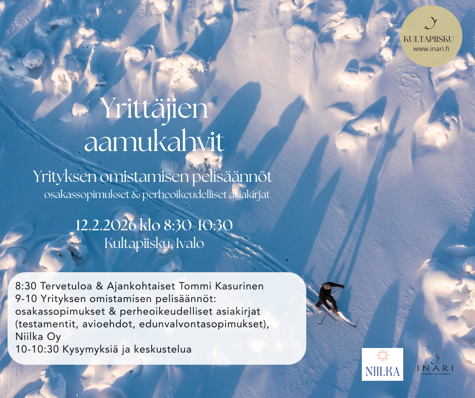 Yrittäjien aamukahvit järjestetään 12.2.2026 klo 8:30 alkaen Kultapiiskussa, Ivalossa.